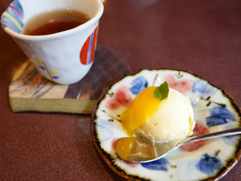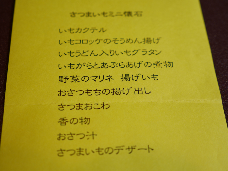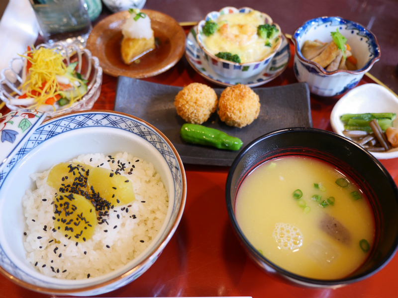 蔵造りのお店が並ぶ一角に陶器屋さんがあります。その奥にある陶路子はリーズナブルにさつまいも料理が楽しめるお店です。注文したのは「さつまいもミニ懐石」1890円。芋ガラの煮物やコロッケなどそれぞれにさつまいもが使われていてとても美味しく、中でもちょっととろみのあるさつまいものお味噌汁とさつま芋がのったおこわが懐かしい味がして絶品でした。