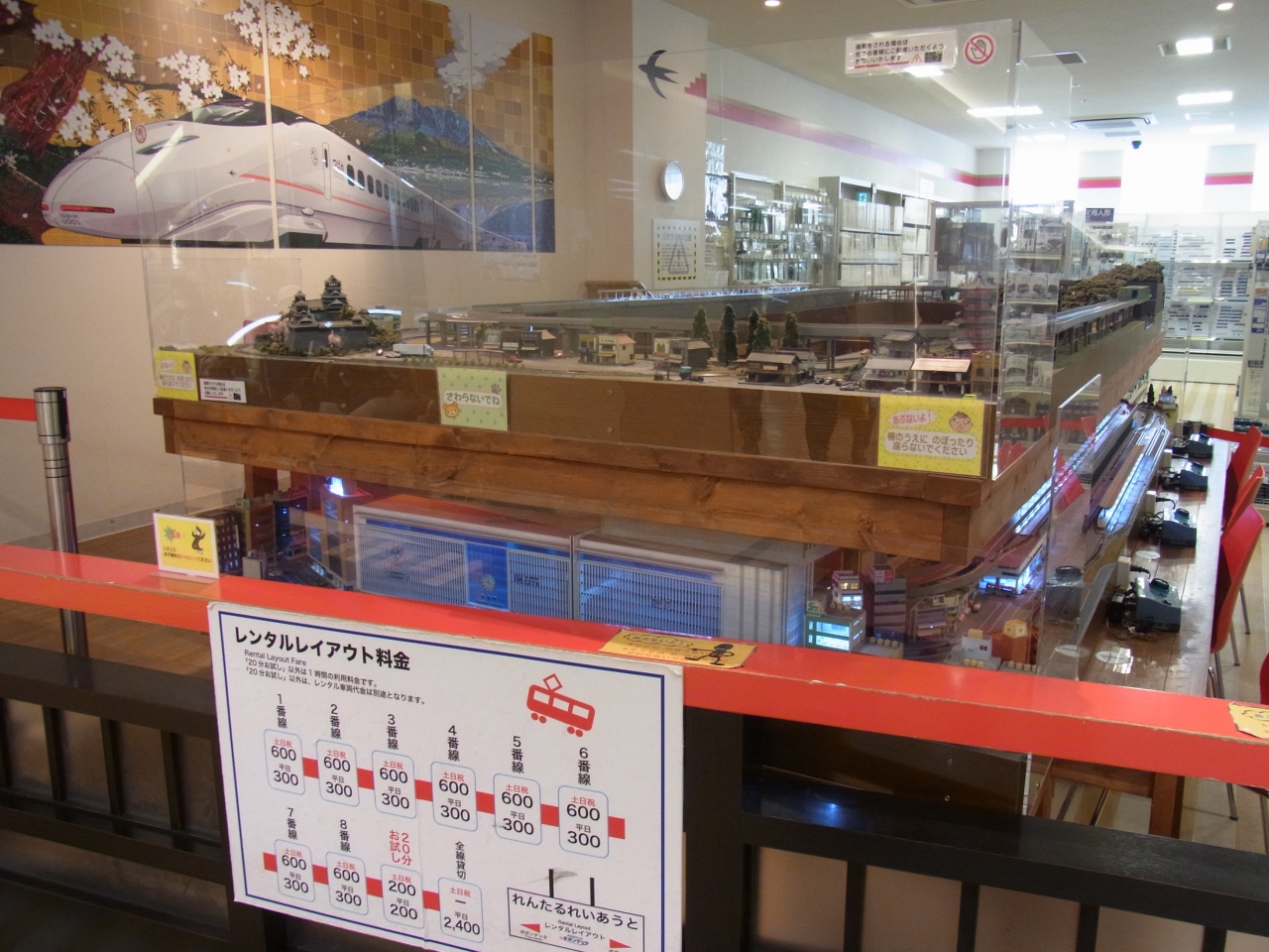 また、ジオラマがあり、実際にNゲージをレイアウトで運転させることができます。レイアウトも、熊本城をはじめとする九州の名所が設置されており、九州を楽しみながら運転ができます。