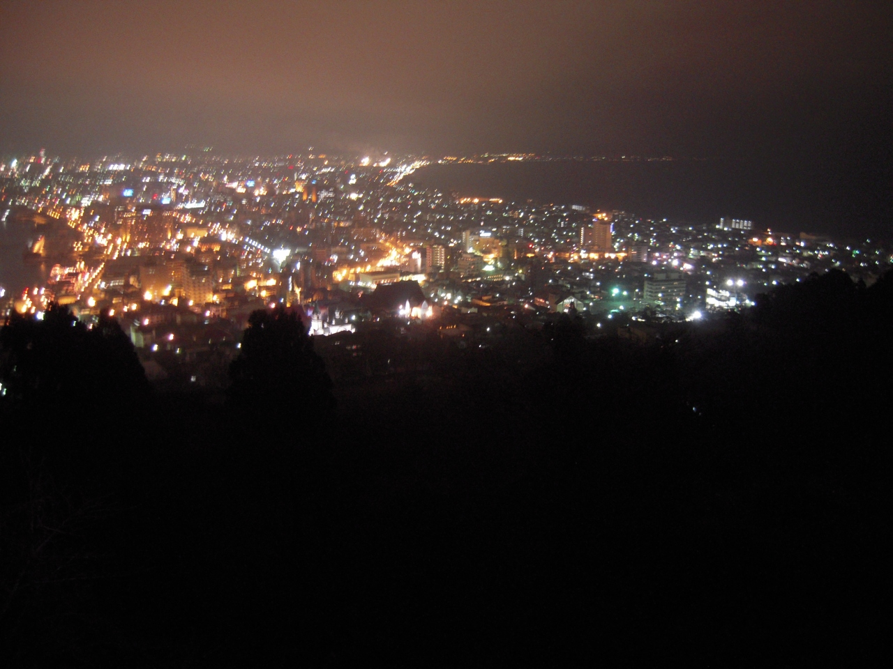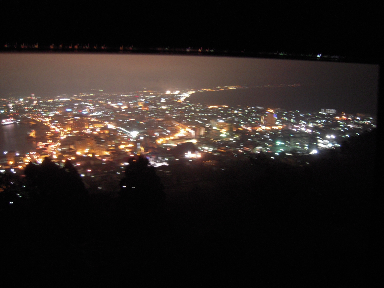 登る途中での夜景スポットにバスを止めて、車内から撮って、皆感激。
