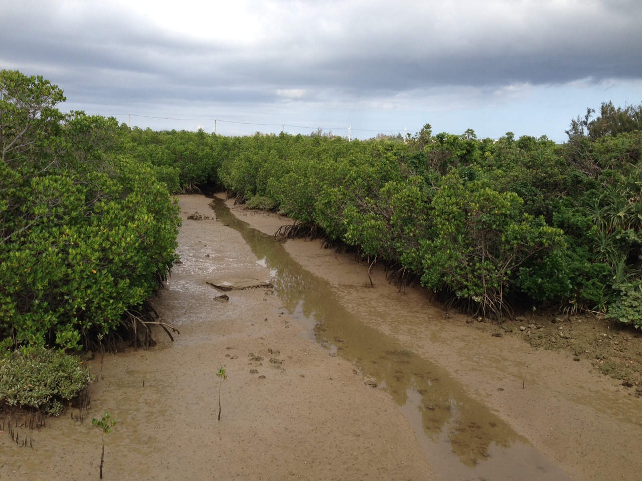 大潮の時期にいったら、マングローブ林の川もだいぶ干上がっていました。干潟をよく見ると、小さな穴がたくさんあいており、カニがわんさか。それを突いて食べている鳥がいて、なかなかスペクタクルでしたよ。すごいグルメ鳥ですね。