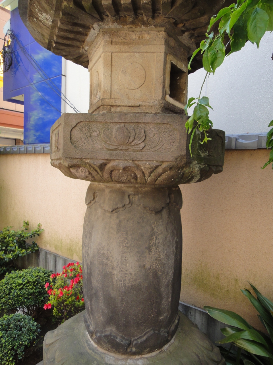 川越駅を降りて、浄土宗西雲寺の前を通ると大きく古そうな石燈籠があり、何気なく見てみると、字が彫られている。