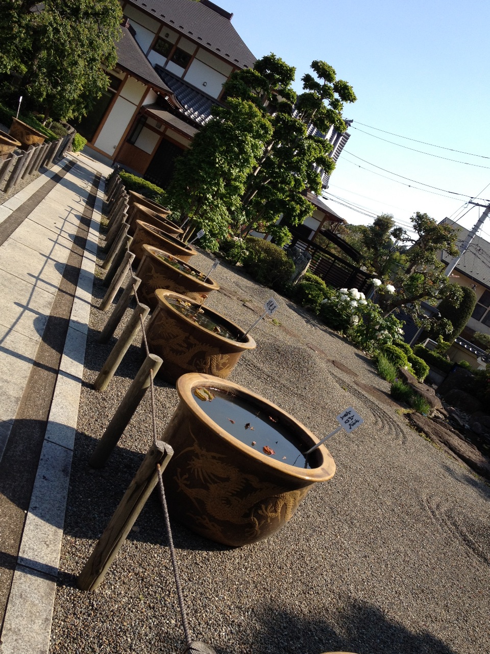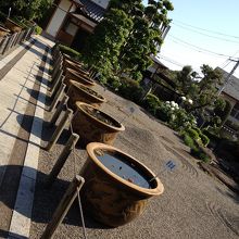 境内には、直径1メーター程度の水盤が10個ほどあり、それぞれの水盤に蓮が入っています。