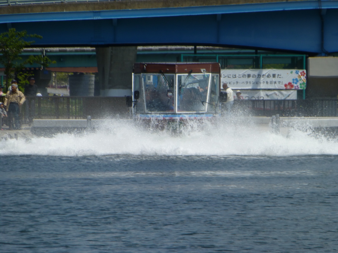 2013年5月4日,ゴールデンウィーク真っ只中に亀戸コースに乗車しました.当日は快晴でしたので,窓のないバスでも快適でした,かえって屋根も透明アクリル板のため暑いほどです.盛夏時にはきついかもしれません.また,窓は透明のビニール幕を下ろせるようでしたが,風雨の時はこれまた厳しいでしょう.実際3月の営業開始直後に風雨のため欠航になった日があったはずです.さて,お楽しみの水上走行ですが,いわゆる運河クルーズというわけではなく,すべりを使て入水して静水の旧中川をぐるぐる回って水陸両用車の性能を楽しむものでした.コース図上もそのように示されていますが,ちょっとガッカリです.今後,運河クルーズ的なことができるようにコースが改良されることを望みます.すべりのある「旧中川川の駅」では出水後,車体の洗浄のため時間があります.また,この時にスカイツリーコース(あるいはその逆)のスカイダックの入出水を見ることができます.亀戸の商店街の風景も高い座席位置から窓ガラスのない直接視界でよく見ることができ楽しむことができました.