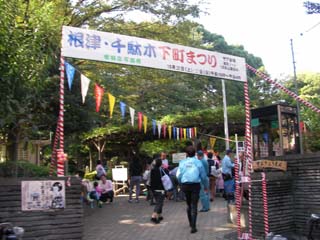団子坂を下って少し住宅地に入ったところに須藤公園があり、元は大名の屋敷の庭園で、斜面を利用して遊歩道は格好の子供の遊び場です。根津・千駄木下町まつりの須藤公園会場では、フリーマーケットや模擬店が出ていて、焼き鳥を七味唐辛子をかけていただきました。