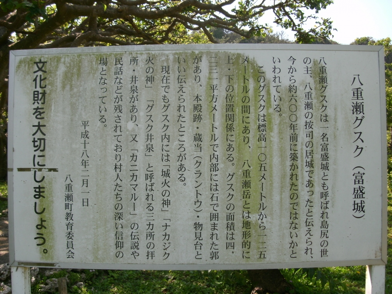 「八重瀬城跡」は、八重瀬町のほぼ中央、那覇ゴルフクラブの北側にある“八重瀬公園”の中にあります。八重瀬岳の中腹にあり、駐車場(無料)からは、階段を登っていくと多目的広場や展望台、東屋などがあり、その一角に八重瀬城跡があります。1400年頃に八重瀬按司により築かれた城で、別名を「富盛グスク」とも呼ばれています。城跡内には、八重瀬按司の墓や拝所、井泉があります。城跡からは八重瀬町を見渡すことが出来ました。城跡と言っても、立派な城壁などが残っている訳でもないので、観光客が訪れることのない、静かなところです。琉球の歴史に興味のある方にお奨めします。