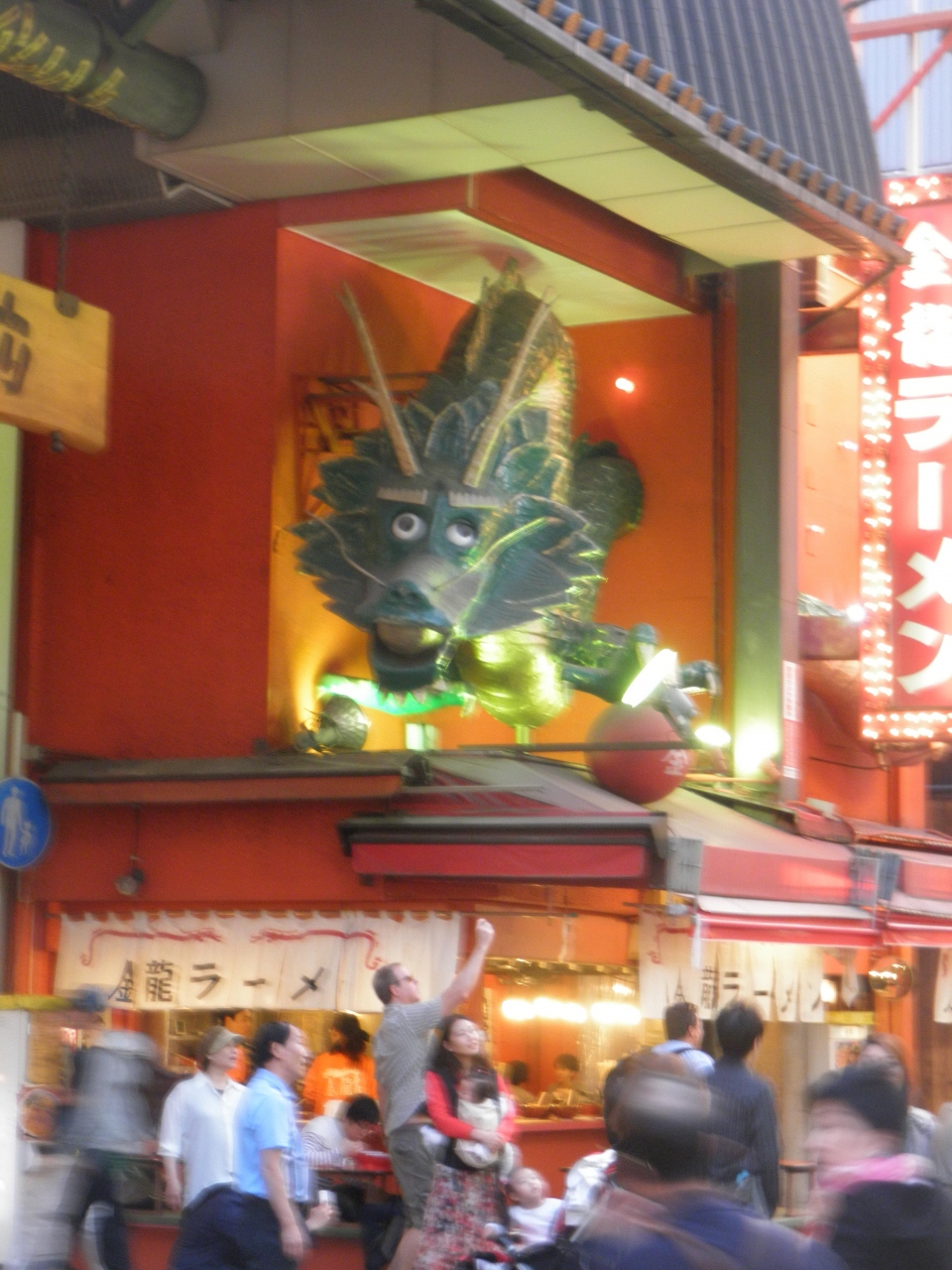 赤い球をもったフニャとした漫画チックな表情の緑の龍のオブジェが目立つお店が金龍ラーメンの戎橋店です。 旅行ガイドブックに載っているので、結構混雑していました。 見た目よりあっさりしたとんこつラーメンで、スープまで全部飲めました。