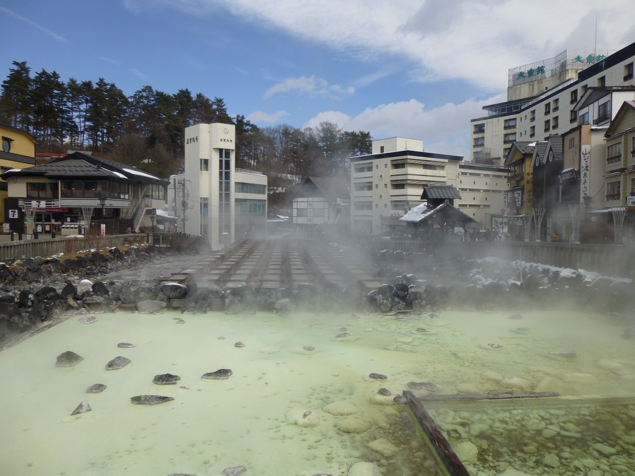 草津温泉の中心にあります。温水が涌き出ているので、常に湯けむりが上がってます。湯畑の周りには、お土産物屋さんが沢山ありました。又、無料の足湯があり、平日にもかかわらず観光客で混んでいました。ベタですが、草津に来たらまずはここですね。