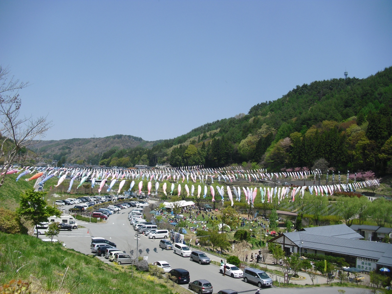 ここ道の駅南きよさとではゴールデンウィークになると隣の川を挟んで何百匹のこいのぼりが泳ぎます。ここまでたくさんのこいのぼりが泳ぐ様は圧巻です。道の駅内ではなく路上から写真を撮るのがいいかもしれません。