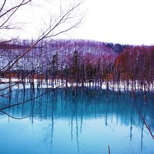 雪の白さと、池の神秘的な青さが、なんとも幻想的な景色でした。