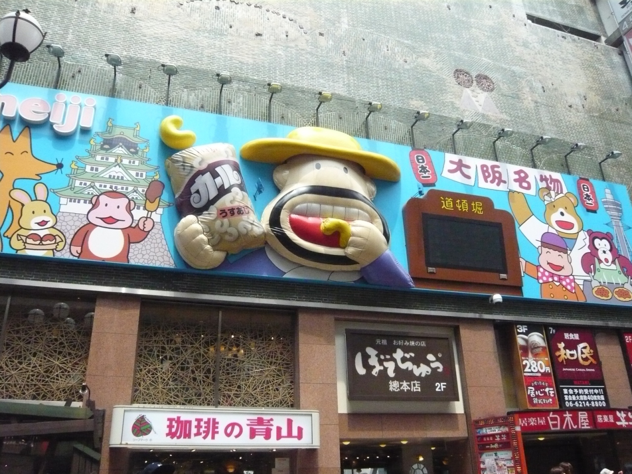 巨大カニ、カールおじさん、づぼらやのフグ、くいだおれ太郎とごっつでかい看板に感動しました。新世界も驚きましたが、ここも負けていません。大勢の観光客でGWは大混雑でたこ焼き屋はなが~い行列でした。くいだおれビルでお土産を買い込みおっきな黄色い袋で困りました。