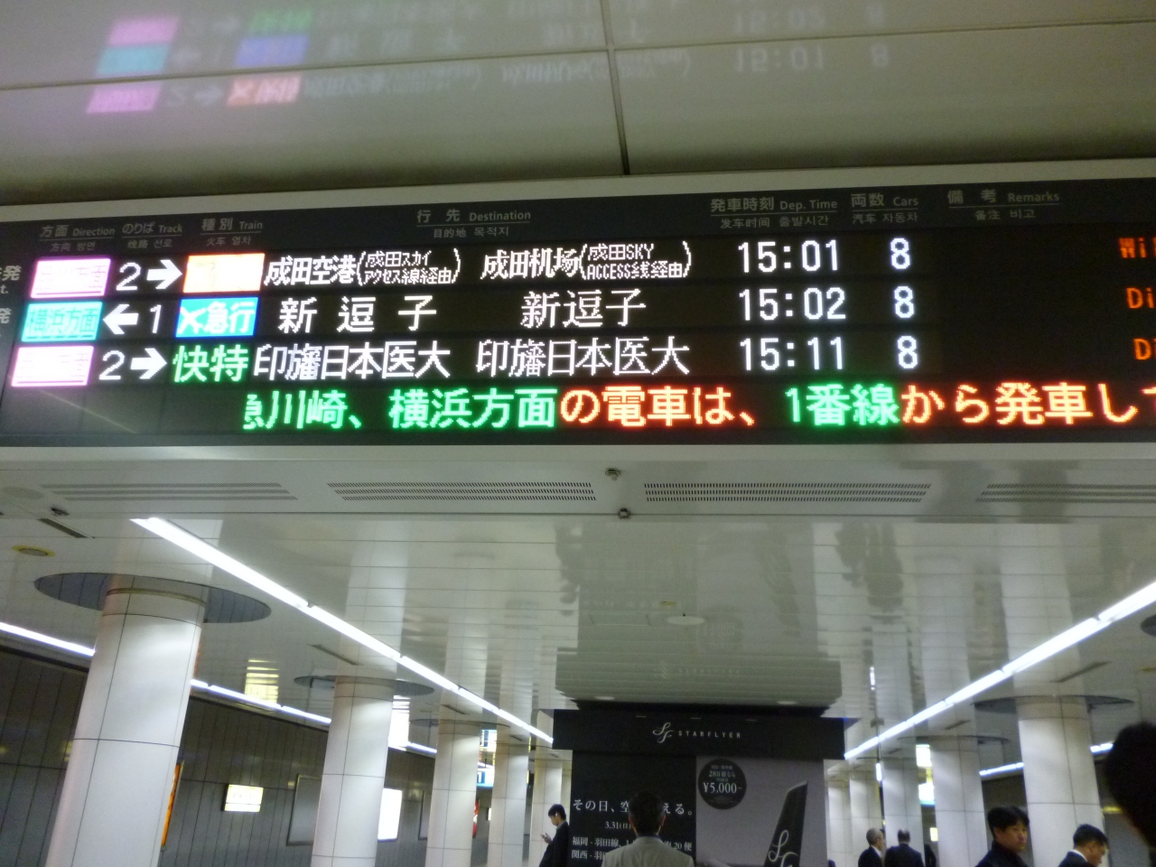 品川へ行く電車に乗りました。案内板を最後まで読まないと、間違えます。「品川、浅草方面は次の電車におのリください」と書いてあるので、パっとみて「品川」の文字が出ていたから乗りましたが、乗客が少なくてなんかヘンだと気づき、降りてよく読むと、わかりました。