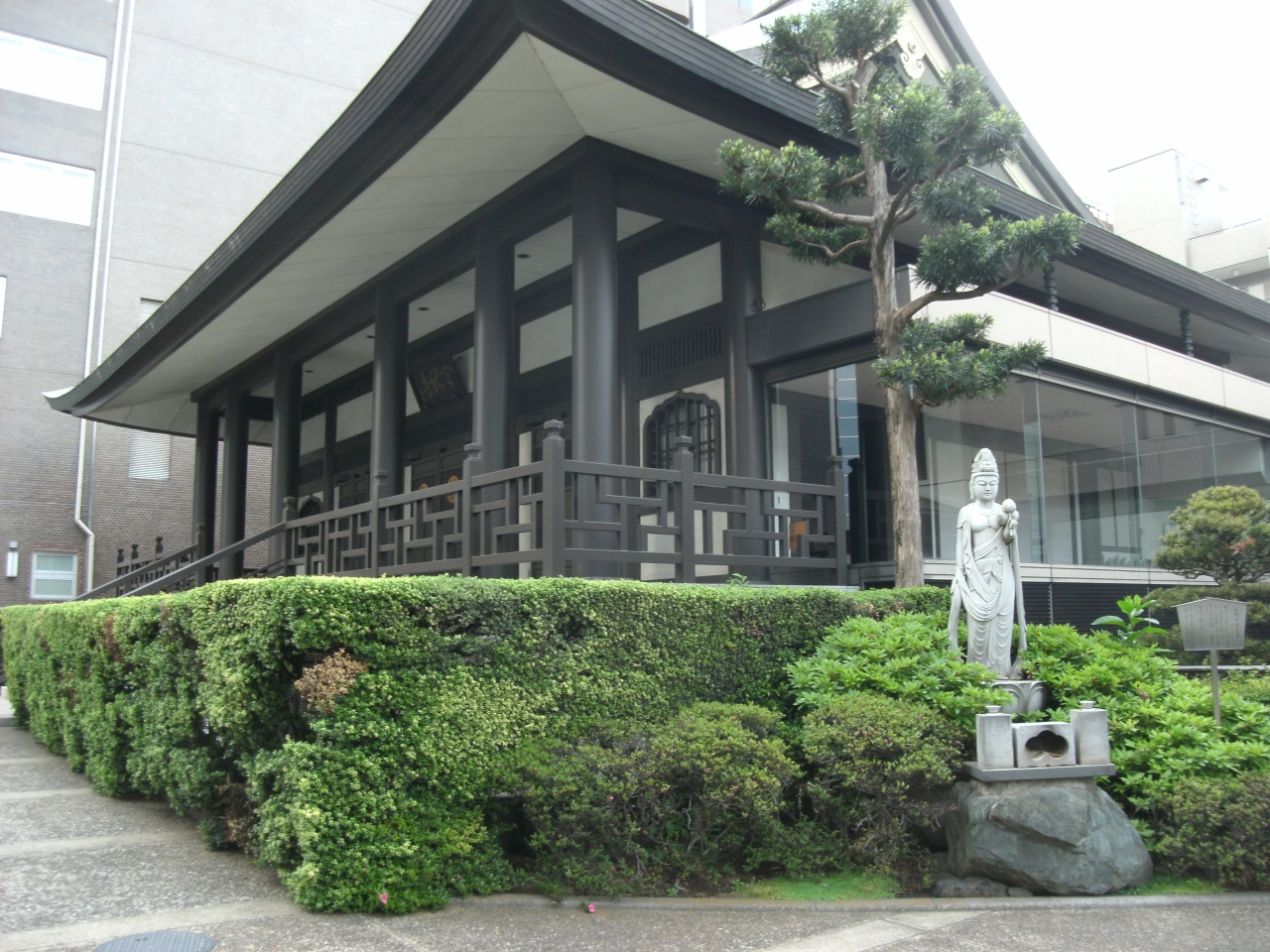 山門が立派です(閉鎖しています)。境内は都心の真っ只中の寺院らしく舗装されています。本堂の横には少しながら植木に囲まれ聖観世菩薩像が祀られていました。墓地もあります。全体的には緑が少ないようなのが残念かな。