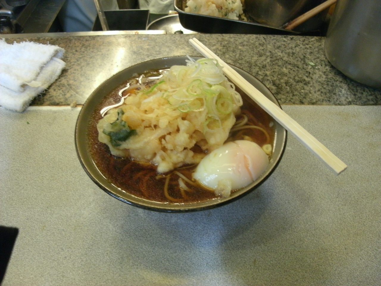 名物天玉そば、温かいか冷たいかを注文。天ぷらと玉子、ネギがのっかってくる。みなさんもくもくと食べます。最近は女性のお客さんもみられます。380円で旨い!