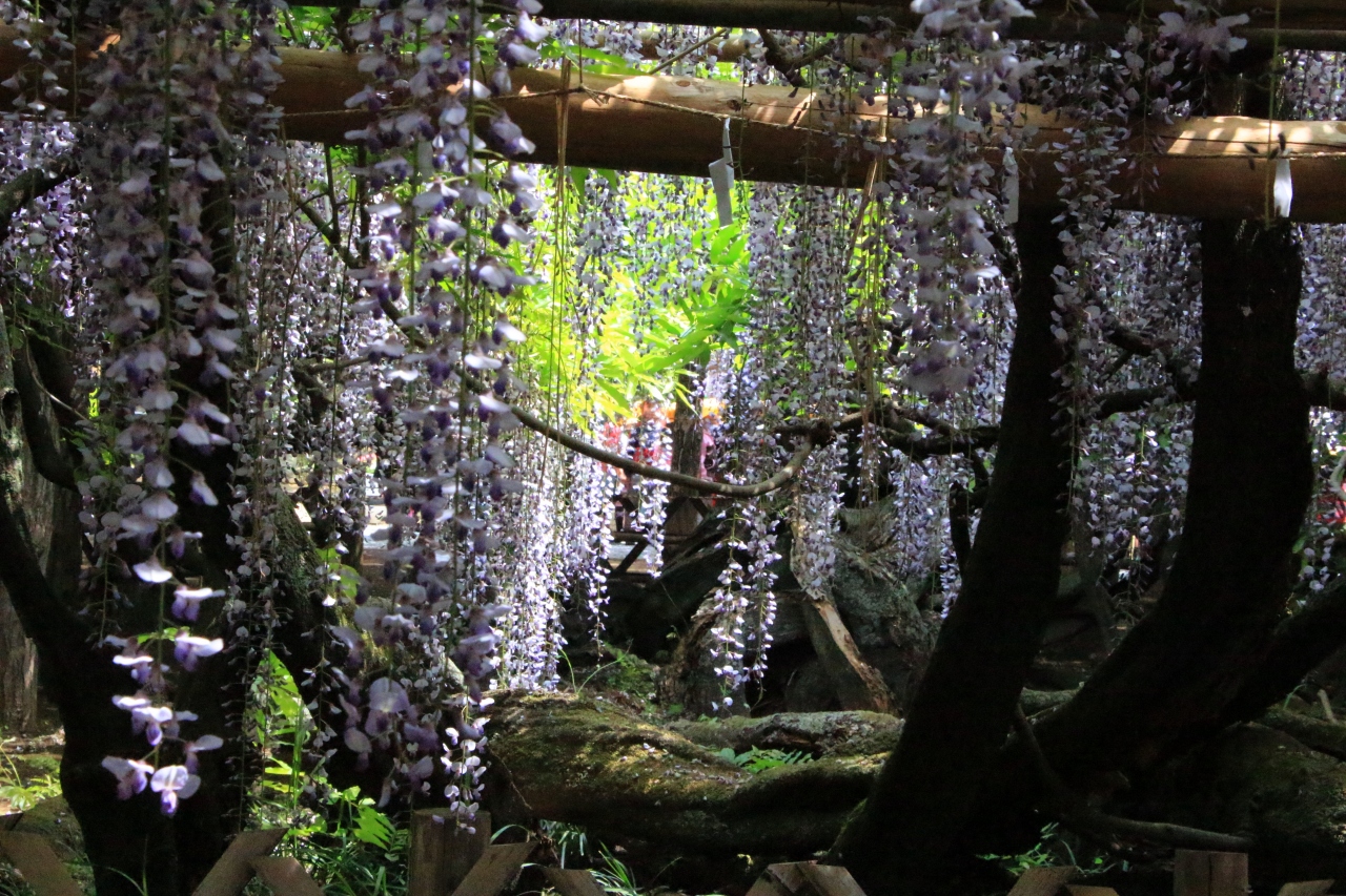 幾重にも絡み付いた根は苔むし、その上に降り注ぐ藤の花が織りなす光景は妖艶ななまめかしさ。