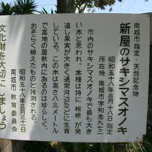 「新屋のサキシマスオウノキ」は、国道331号線の知念のバス停から、北方向に路地を数10mほど入った民家の敷地内にあります。南城市で一番大きなサキシマスオウノキで、高さは約8.3mもあります。大きな板根を持つ、サキシマスオウノキは通常、河辺などに育つものですが、ここの木は高地の敷地内という珍しい場所にあり、恐らく植えられたものと考えられています。南城市の天然記念物に指定されています。民家の敷地内にあるので、みだりに入り込まず、静かに少しはなれたところから見るようにしましょう。