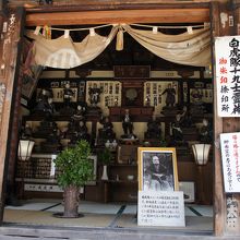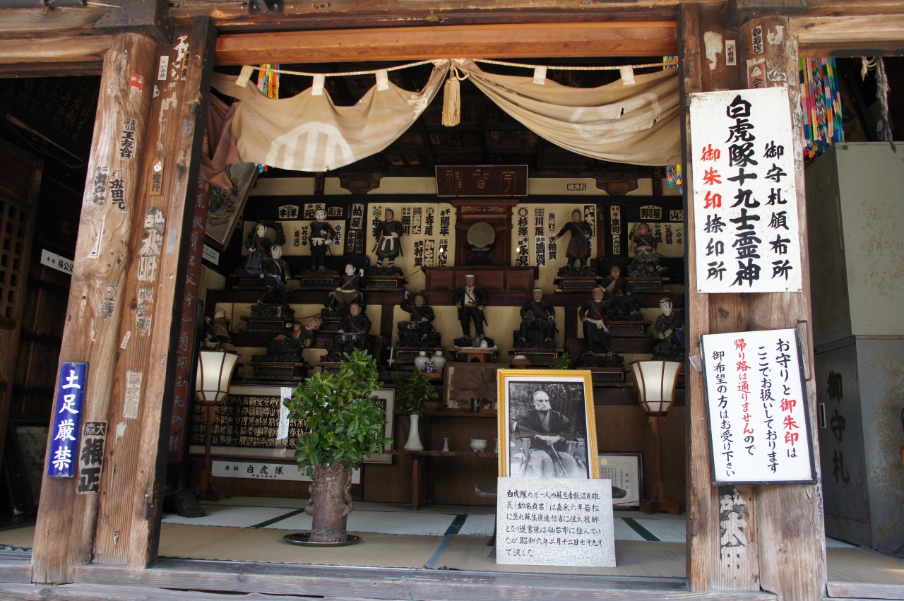 宇賀神堂は、さざえ堂の隣り。会津藩三代藩主松平正容が宇賀神を勧請し弁財天像を神像として建立した神社ですが、この中には、白虎隊19士の木像が安置されていて、のぞくとお堂いっぱいにこっちを向いて並んでいます。なぜか、像はフランス流の洋服姿ですが、そんなに違和感はないと思います。