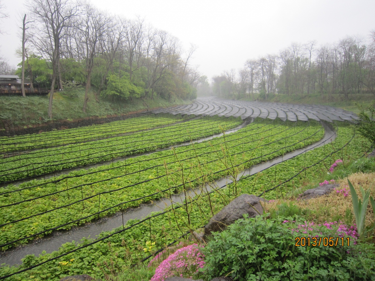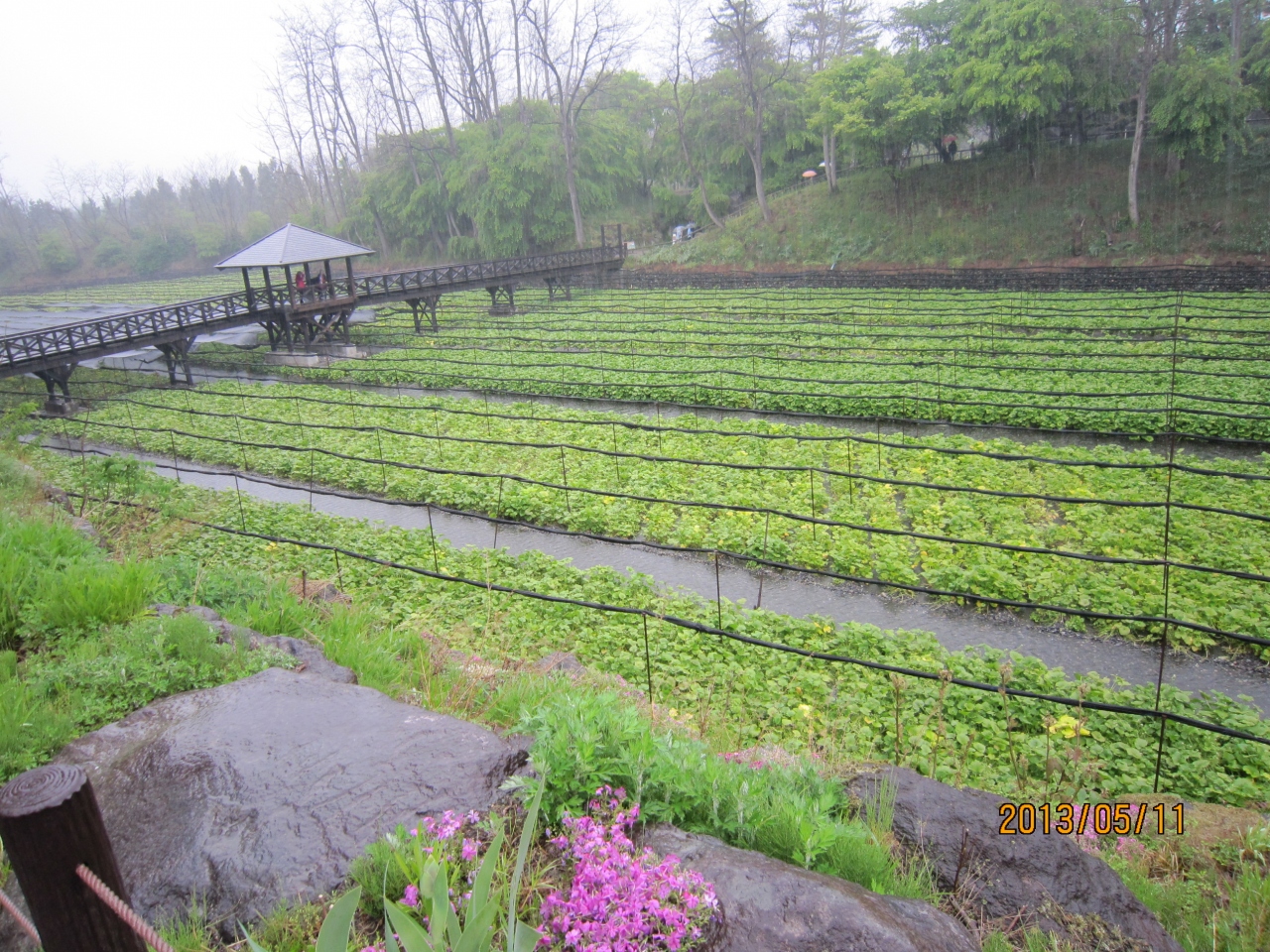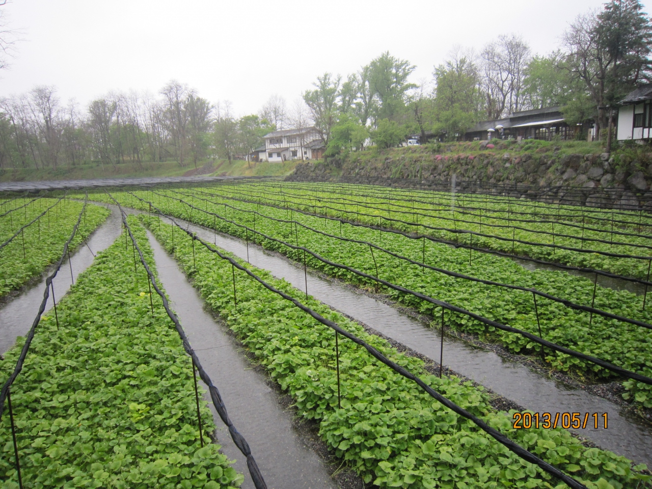 ここは日本最大級のわさび農場なのだそうですが、ゆるやかな曲線を描きながら一面に広がるわさび田の眺めは何とも言えず、そのわさび田の間を流れる湧水は、雨が降っていても濁ることなく透き通っていて、わさびは清流でなければ育たないと言うことがしみじみと実感できる光景でした。