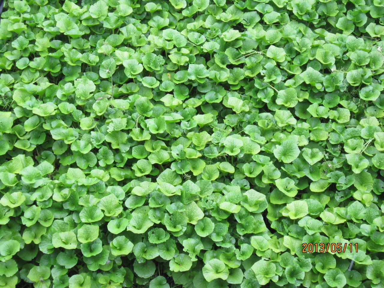 わさび田には直射日光を避ける為の黒いネット(寒冷紗)がかけられていましたが、わさび田の上に架かっている「幸いのかけ橋」近くには、その寒冷紗がかかっていない部分もあり、群生しているわさびの葉がよく見えました。