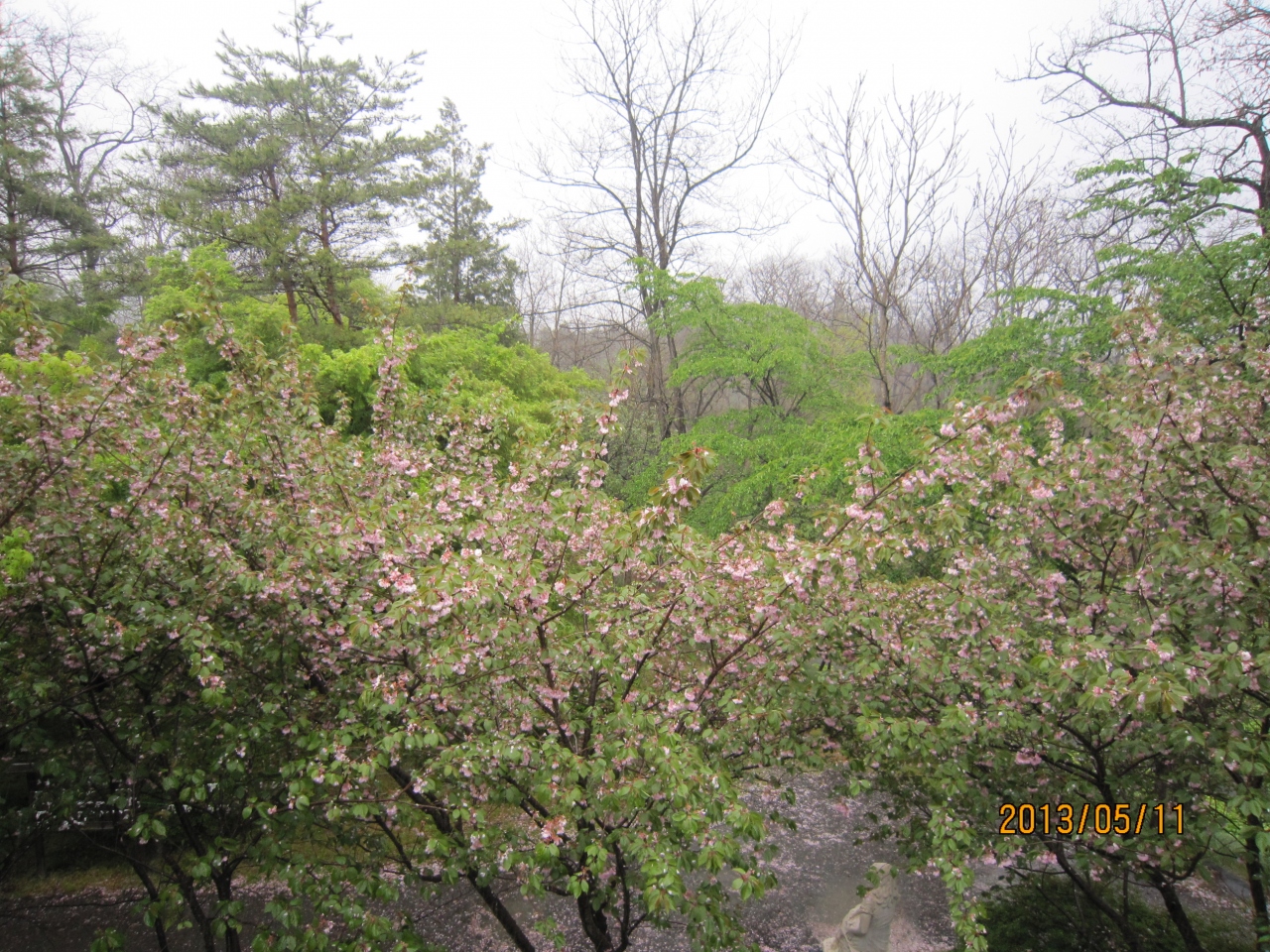 場内には「水車小屋」等、いくつかの見どころがあり、農場が一望できると言う「大王さまの見張り台(全然、高くありません)」付近には八重桜がまだ少しだけ咲いていました。
