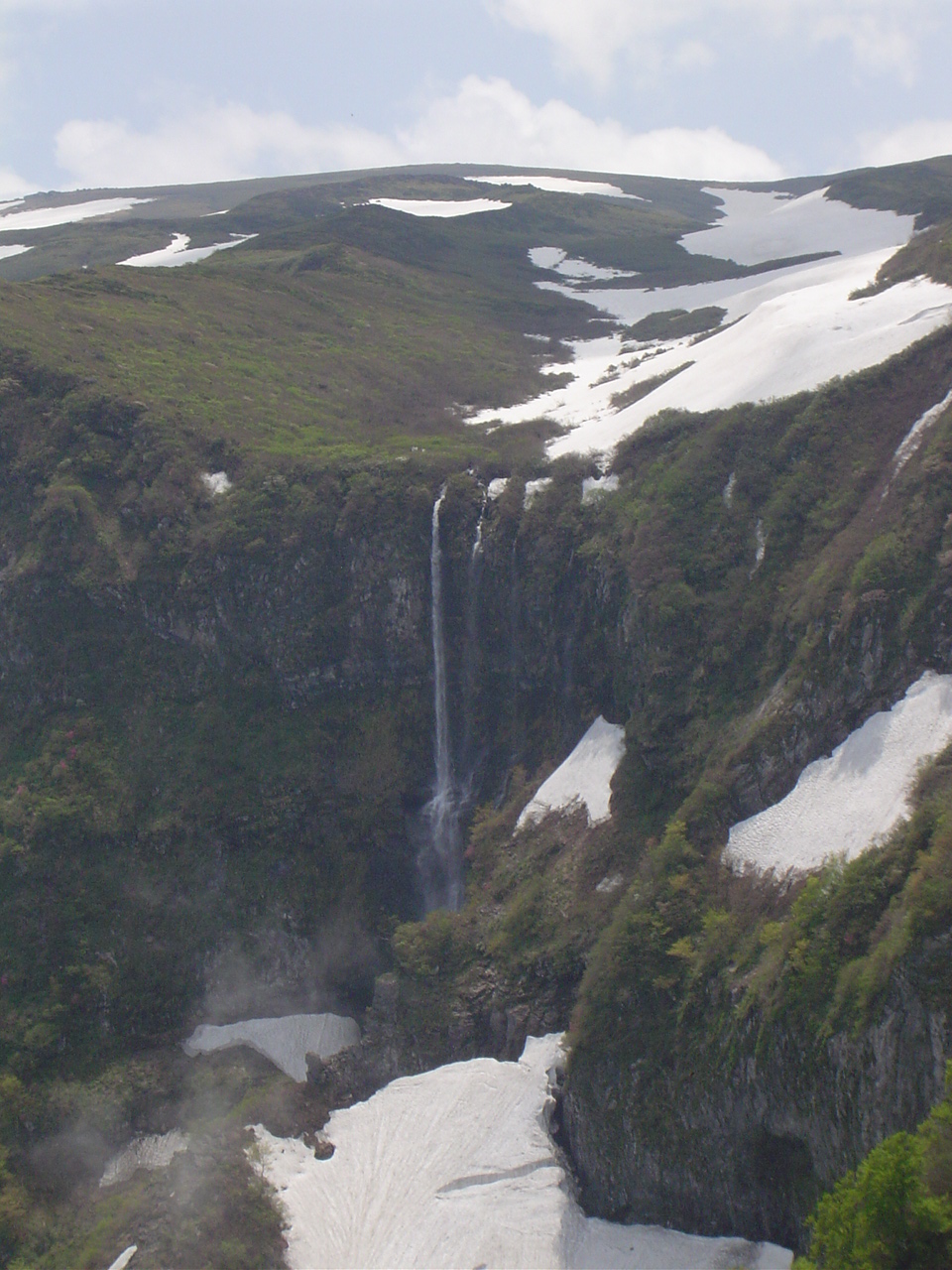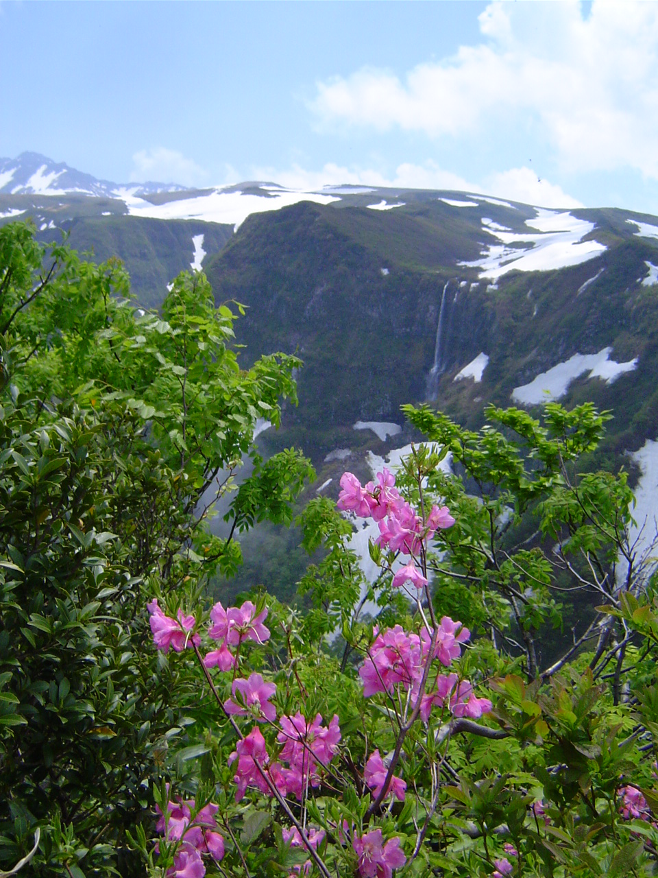 圧巻は、この時期に出現する「幻の滝」(「白糸の滝」と呼ばれているようです)と、残雪の上で一斉に咲く桜やタムシバ、ツツジの花でした。まだ登山はできませんが、この時期ならではの風景を楽しめました。