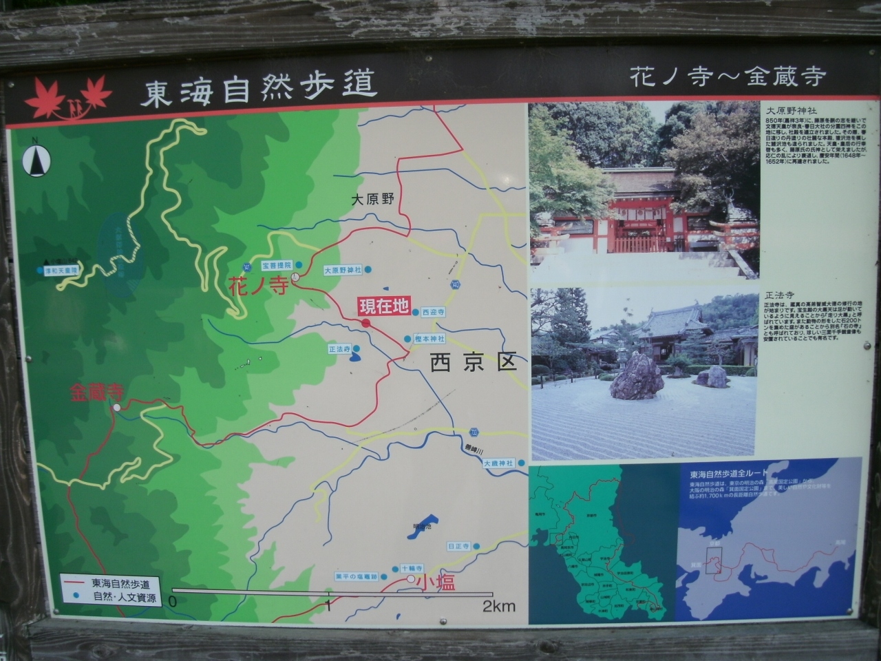 「東海自然歩道」は、東京の明治の森・高尾国定公園と大阪の明治の森・箕面国定公園を結ぶ自然歩道です。その延長は約1,698キロメートルにおよび、昭和49年春に完成しました。そのうち、京都府内の総延長は157.1キロメートルで、豊かな自然や多くの文化財にふれながら、京都市、宇治市、宇治田原町、和束町、南山城村、笠置町の2市3町1村を通過しています。4月の天気の良い日に、京都洛西の東海自然歩道の一部を歩いてみました。花の寺や大原野神社、正法寺、金蔵寺など静かで落ち着いた雰囲気の寺社がたくさんあるので、オススメのコースです。