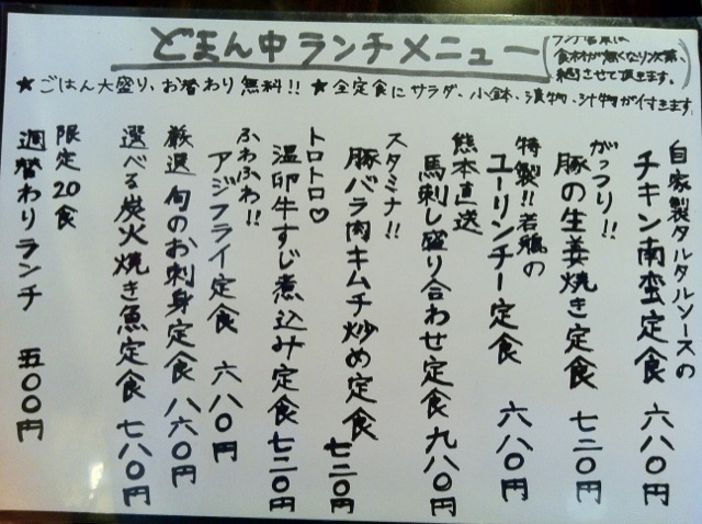 高田馬場駅から徒歩5分ほど、メイン通りから少し入ったところにあります。夜は、居酒屋、昼は、ランチをやってます。ランチは、500円~で様々なメニューがあります。馬刺しも1000円以内で、結構な量が食べれます。