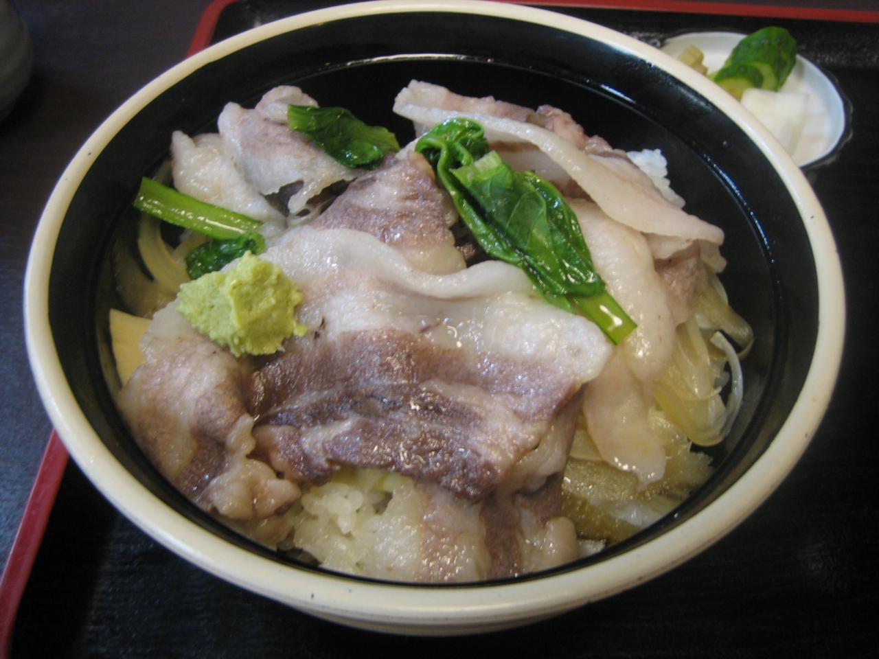 出てきた丼は脂身の多い肉。いのししってこんなに脂あった?と思いながら食べると