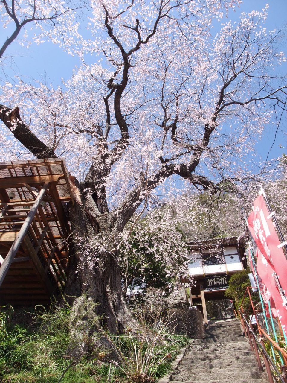 またここは木曽義仲ゆかりの寺としても知られています。戦勝祈願に訪れた木曽義仲が手植えしたとか、馬を繋いだとか伝わる樹齢800年のエドヒガンザクラがあります。私はこの桜が好きで、開花時期には毎年訪れています。今年は例年よりかなり開花が早かったようですが、ちょうど良い時期に尋ねることができ、満開の桜が見え、満足です。