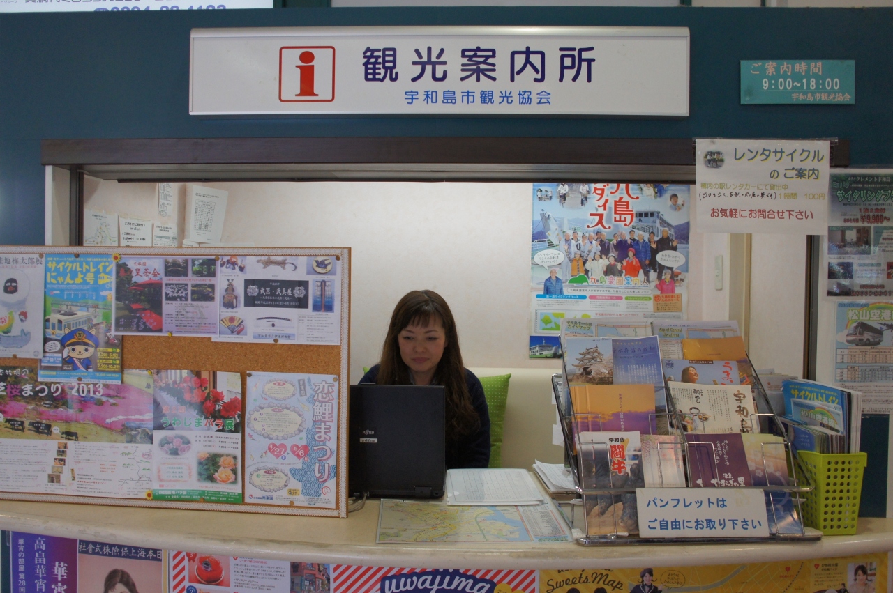 宇和島駅の構内にある宇和島観光情報センターは、小さなボックスに常駐の係りの人が一人座っていて、もうそれでいっぱいといった粗末なものでした。