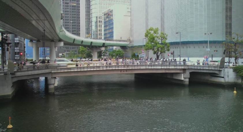 肥後橋界隈は大企業の本社や支社が多く、肥後橋も交通量の多い橋です。