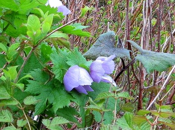 売店を出て道路脇の崖に「シラネアオイ」が固まって咲いているのを