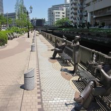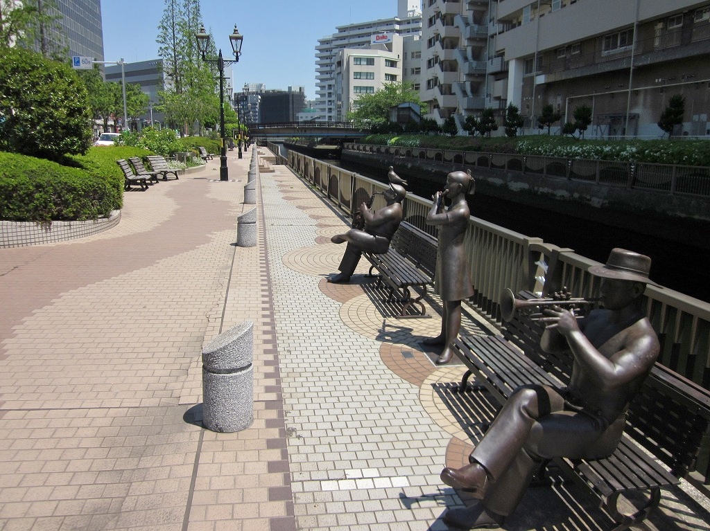 モノレールをくぐった北側の芝浦2丁目付近は、遊歩道の幅も広く、ガス灯や楽器を奏でる人の銅像なども設置されています。