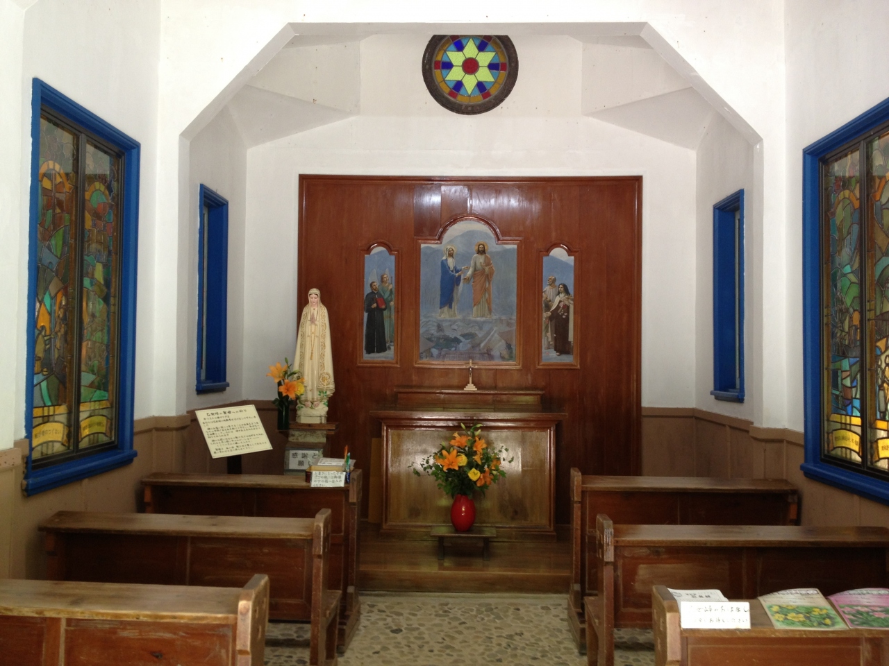 聖堂はこじんまりとしていてとてもかわいらしい外観です。ステンドグラスにはキリシタン信徒の苦難の場面が描かれています。聖堂までは200m程度、急な坂道を登って行きます。虫もいたので虫除けを持って行くといいかもしれません。