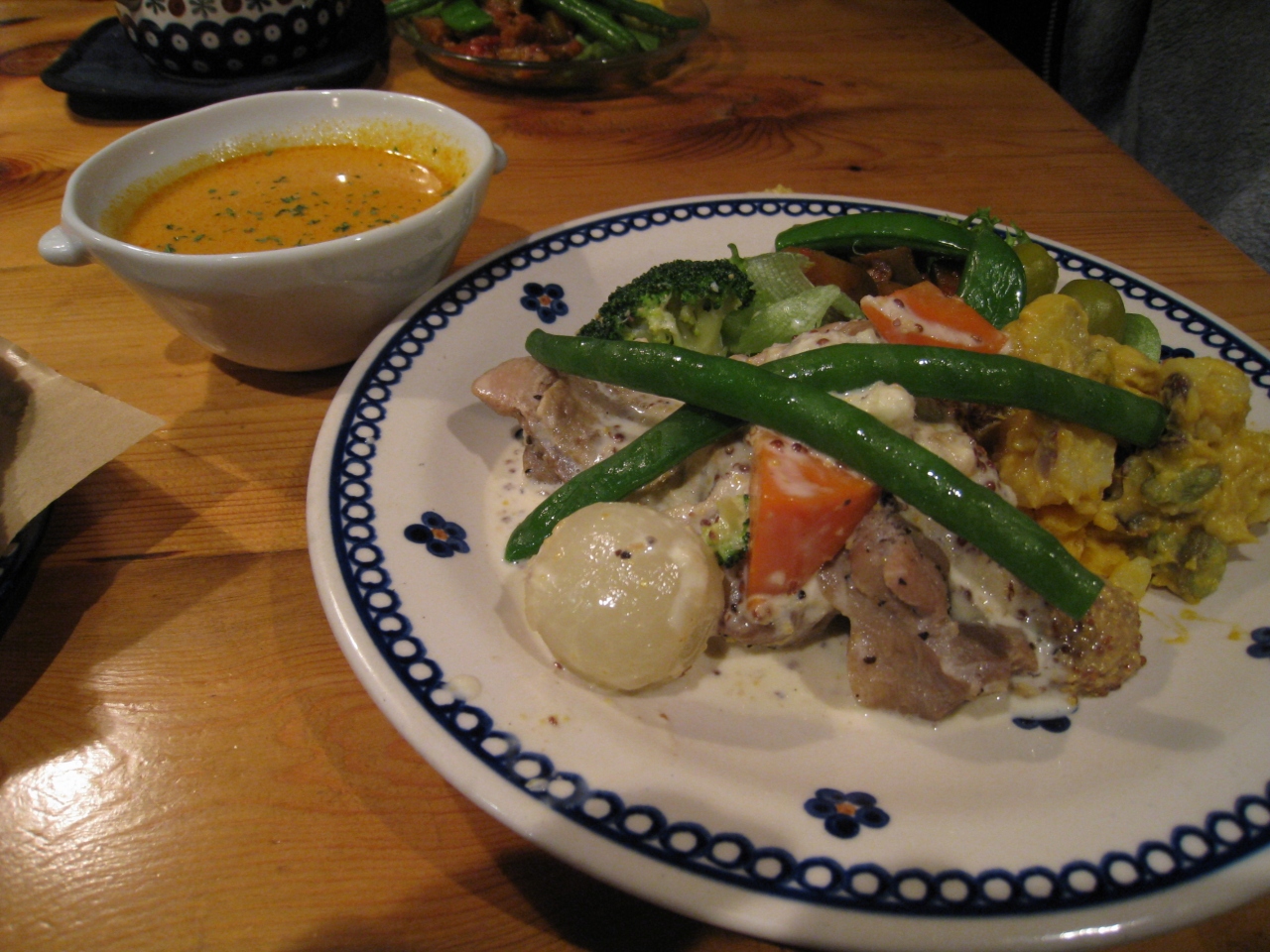 パンを買うついでに聞いてみて、1時間後ならと言われて、出直してレストランに来ました。若鶏のマスタードソースを食べましたが、おいしかったです。一緒に出されるパンももちろんおいしいものでした。噛めば噛むほど味わいが出てくると言うのでしょうか。