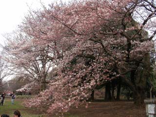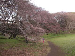 世田谷区総合体育館のプールで泳いだ後は、隣の砧公園に向かうと、花冷のため広い公園内にサクラが3分咲きです。お花見には寒いですが、しばらくはお花見が出来そうです。広い園内は、以前はゴルフ場だったので芝生が広がっています。