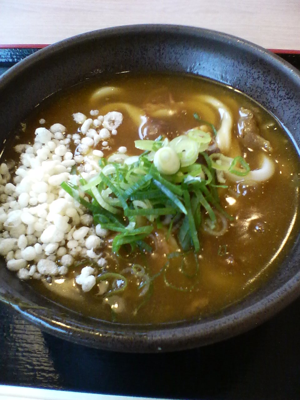 名古屋風の、沈んだうどんが見えないような濃厚なカレー汁とは違っていて少し透明感がありました。肉うどんの肉と同じとすれば牛肉でしょうか。上に無料の揚げ玉、青ネギを添えて。地方ごとに特色が違って改めて奥が深いなと思いました。