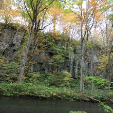 遊歩道を渓流沿いに歩いていると川の流れだけでなく、切立った岩肌にも目が行きます。昔の火山活動で生まれた断崖だそうで、芸術作品のように岩が見事に削れています。