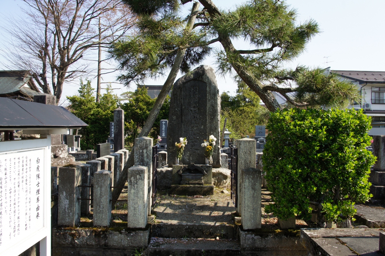 白虎隊士仮埋葬地は、妙国寺の境内に入らず、駐車場の方から入ります。ちょっと、分かりにくいかも。白虎隊士の遺体は誰も手を触れることが出来ず、野ざらしの状態であったのですが、牛ヶ墓の吉田伊惣治という人が余りにも可愛そうに思い、夜な夜な遺体をこの墓地に運び埋葬したのだそうです。