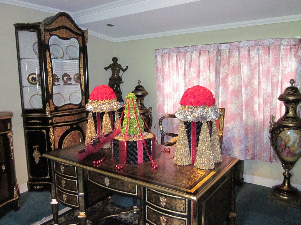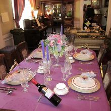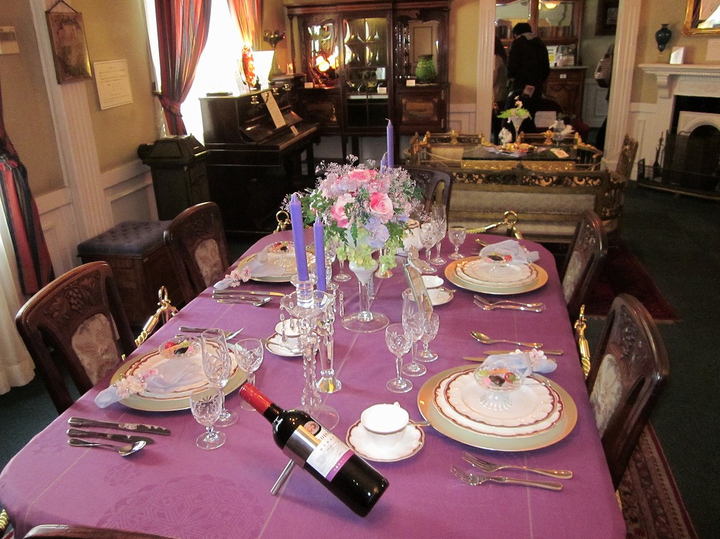 部屋の中は、フランスの家具や調度品、ガラス工芸品などの展示館のようになっていて、テーブルの上の食器や生け花のコーディネートがきれいでした。