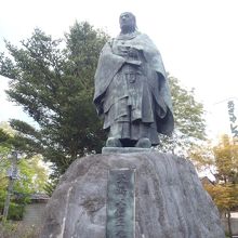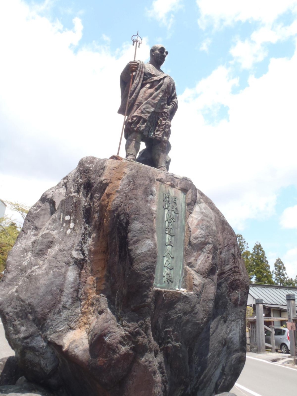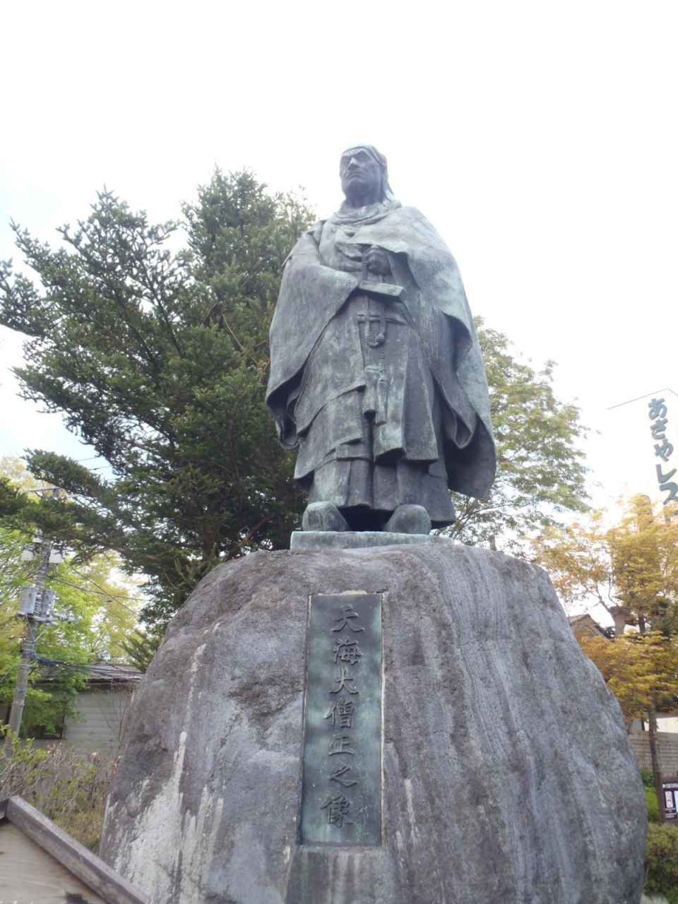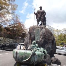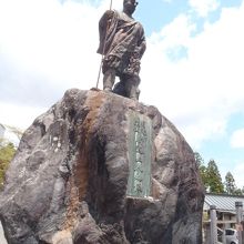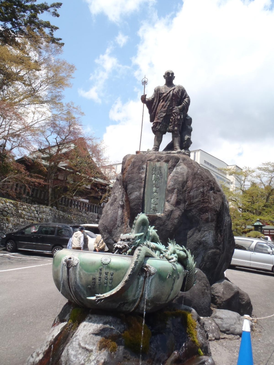 輪王寺三仏堂を背景にして日光山の開祖、勝道上人の銅像が岩の上に立っている。