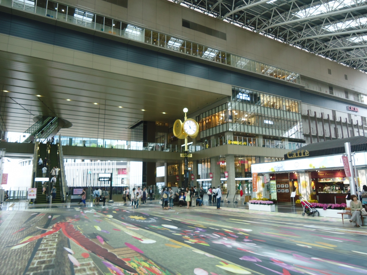 JR大阪駅の上に時空の広場があります。広場は広く時空の広場を象徴する時計があります。ベンチがたくさんありました。そしてきれいな花が咲いているプランタンがあちこちにおいてありました。広い大阪駅での待ち合わせにわかりやすくいいなあと思いました。