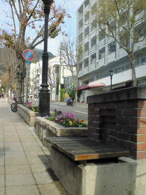 道路脇には色とりどりの花が咲く花壇や、暖炉を思わせるレンガ造りのベンチがあり、外国の街並みのような雰囲気を出しています。