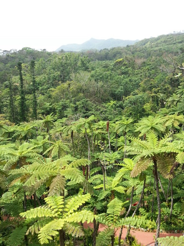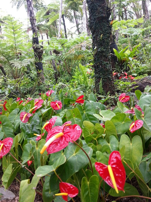 急な山肌いっぱいに傘を広げたようなヘゴの森を上から見下ろしたり、歩きやすいように整備された歩道を進めば、鮮やかなランやサトイモ科の花、バナナなどの亜熱帯植物が林床を飾る太古の森の雰囲気を楽しめます。