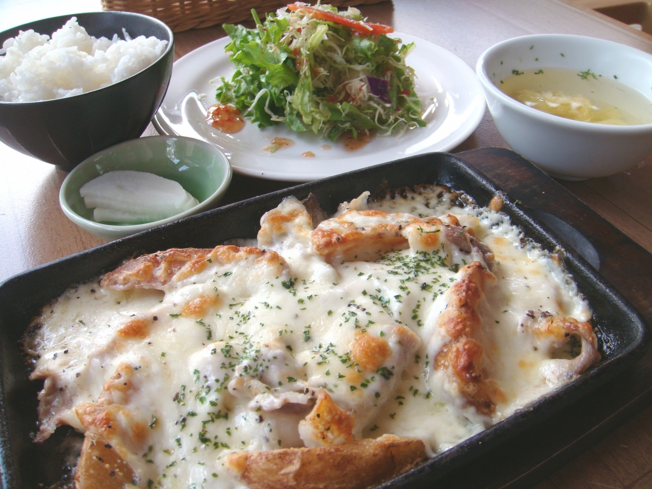 ランチセットは、豚バラとポテトのチーズ焼き・サラダ・スープ・ドリンクで700円です。