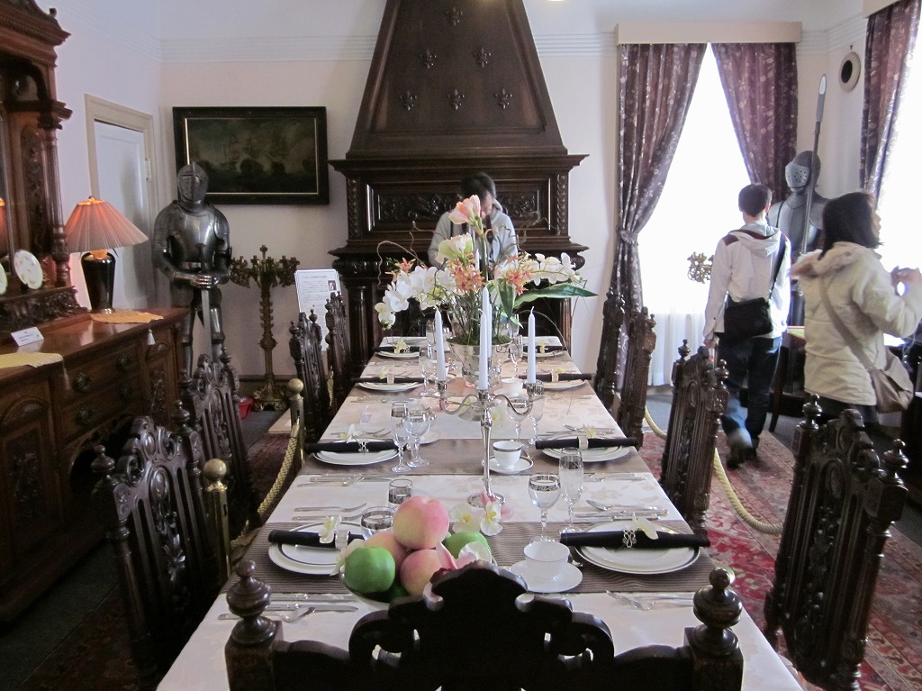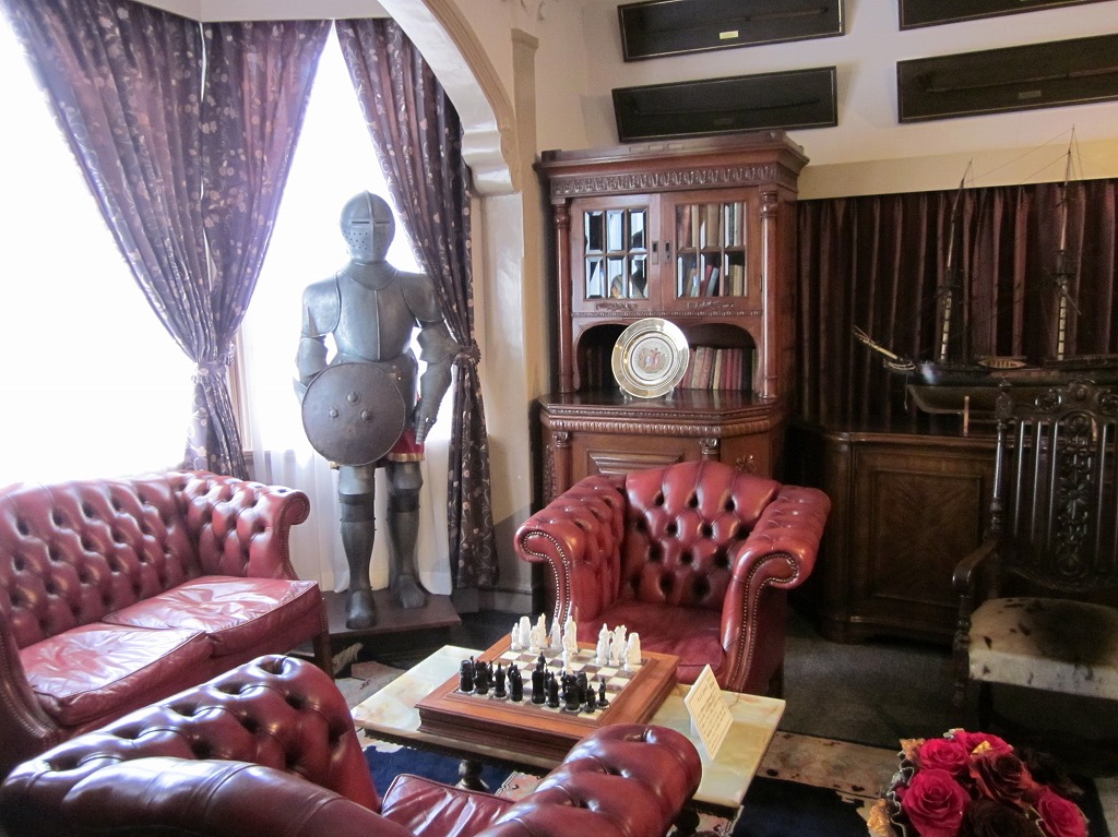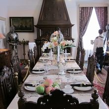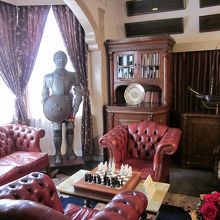 1階の入ってすぐの部屋には、大きなダイニングテーブルと大きな暖炉があり、暖炉の左右には西洋の鎧が飾られています。隣の部屋にはソファとここにも鎧が飾られています。西洋の社交場には鎧が必需品のようです(笑)