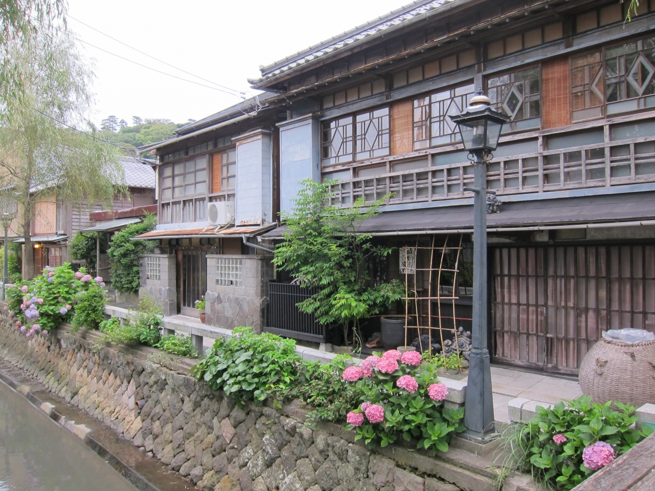 下田らしいレトロな町並みが残る一角です。川沿いに骨董店、カフェ、食堂が並んでおり雰囲気があります。ここからは下田公園のあじさい園を見上げることができます。しかし、そんなの長くはなく見て回るには20分もあれば充分です。また、近くには駐車場がありません。