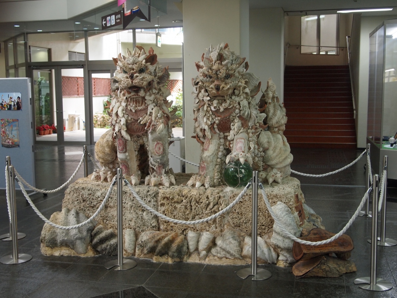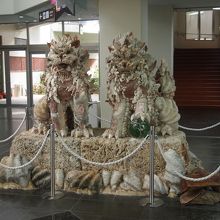 宮古空港の1階の中央部に1対の2mほどのいさましいシーサが鎮座しています。
