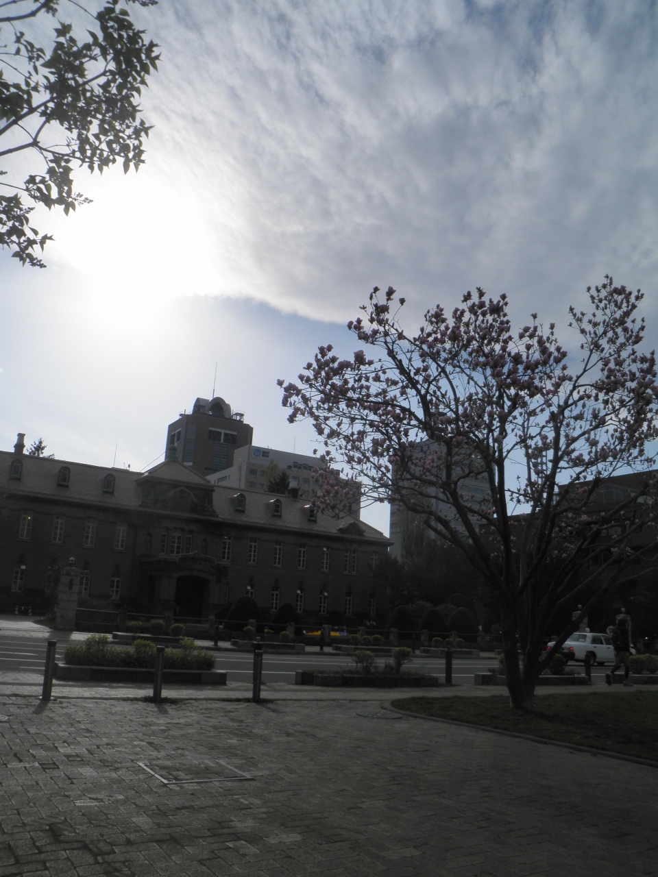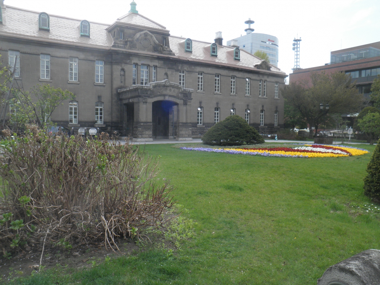 札幌の大通公園の西の端には、重厚な石造りの札幌資料館があります。 札幌の街の歴史についての展示があります。 長かった冬が終わり、春になり周囲の木々の緑が鮮やかです。 前庭の花壇には花が植えられて、向かい側の大通公園の桜も満開で、芝生も青々あしていました。