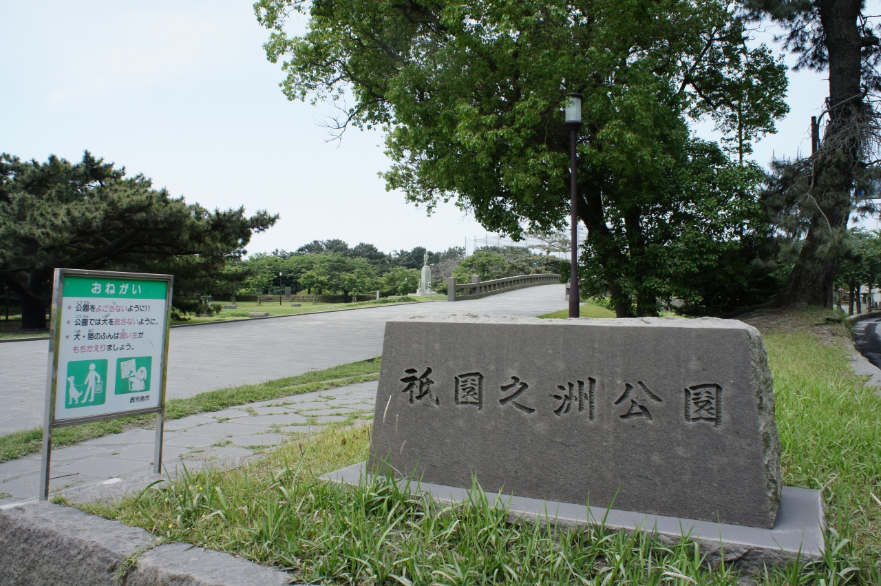 祇園之洲公園は、石橋記念公園と橋でつながっている公園。アーチ石橋を造った肥後の名石工「岩永三五郎」の像や薩英戦争の砲台跡、西南の役官軍戦没者慰霊之塔などもあります。東郷平八郎の像がある多賀山公園も、ここが登り口です。