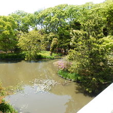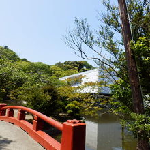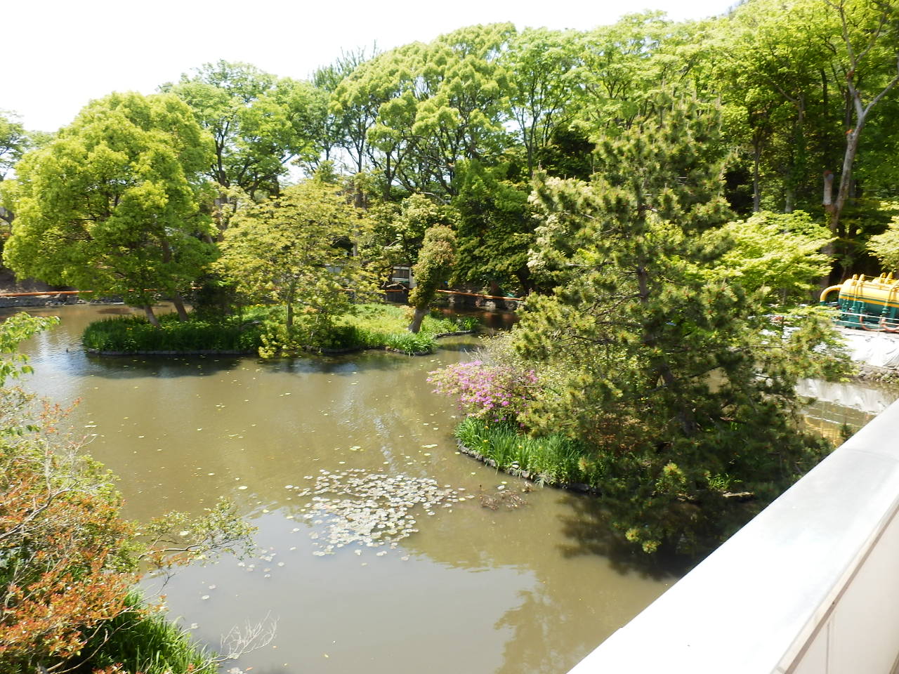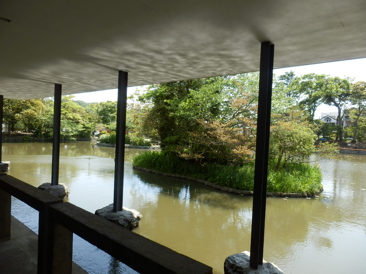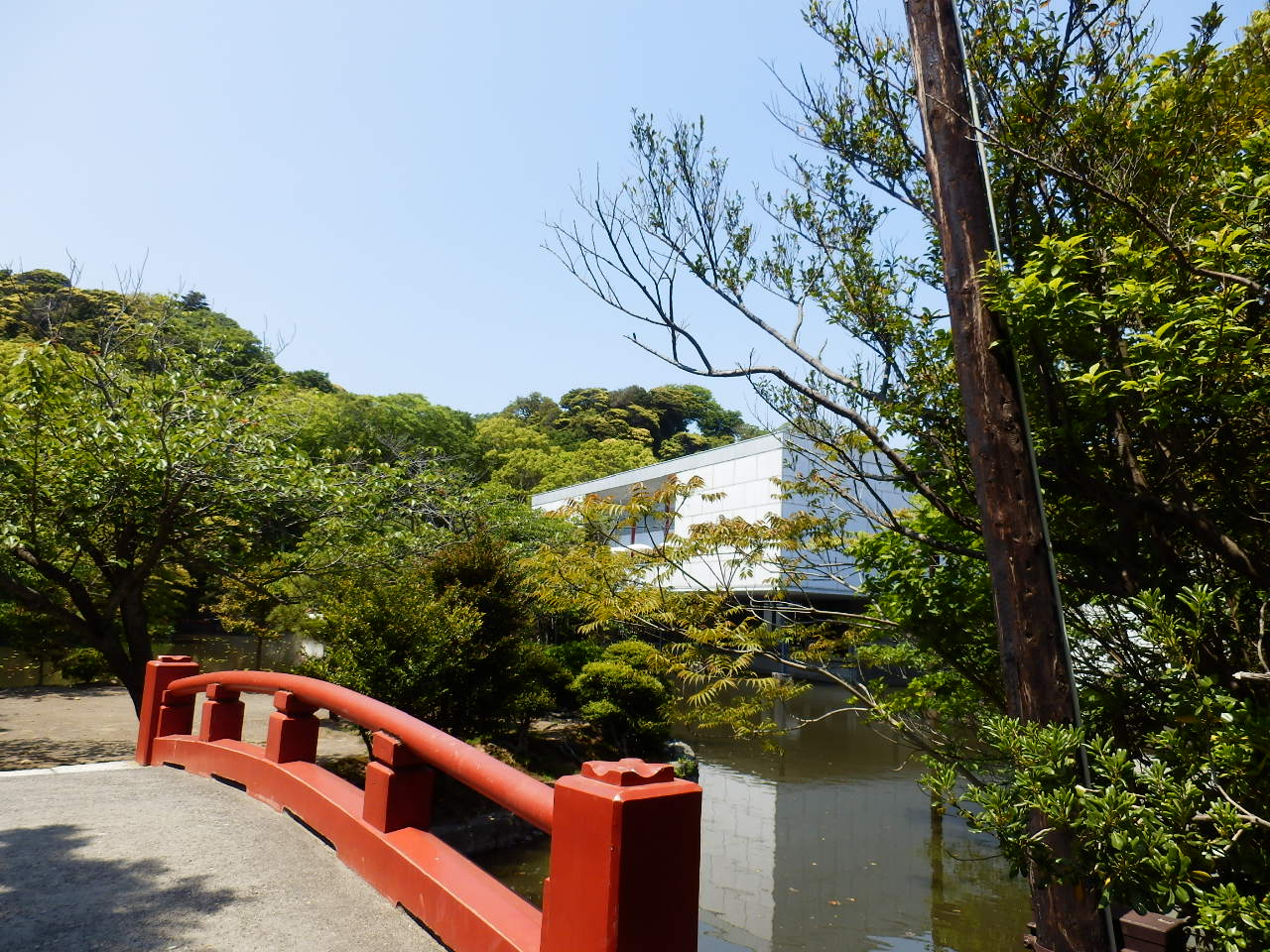 鶴岡八幡宮の門をくぐってすぐ、左右に広がっているのが源平池です。右側が源氏池で周りを囲むようにボタン苑があります。左側は平家池で平家池の奥には神奈川県立近代美術館の鎌倉館があり、美術館の1階あるいは2階カフェのテラスからは平家池が眺められるようになっていました。